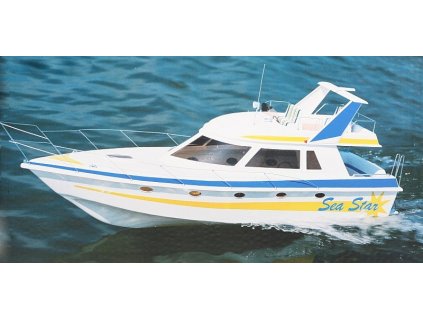 Stavebnice motorové jachty pro elektromotory řady 500. Model v rozsypu s trupem a nástavbami z plastu PSH, lodní hřídel, kormidlo a maketové příslušenství.