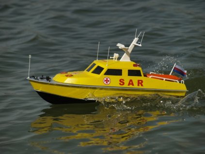 Stavebnice záchranářského člunu pro elektromotory řady 400. Model v rozsypu s trupem a nástavbami z plastu PSH, lodní hřídel, kormidlo a maketové příslušenství.