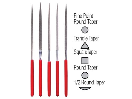 Sada 5 diamantových jehlových pilníků ZONA - kulatý, kulatý s ostrým hrotem, trojúhelníkový-rovnostranný, čtyřhranný-čtvercový, půlkulatý. Pro přesné opracování skla, kovů,...