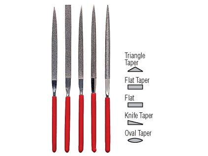 Sada 5 diamantových jehlových pilníků ZONA - trojúhelníkový-nízký tupoúhlý, čtyřhranný-plochý, čtyřhranný-plochý s ostrou špičkou, nožovitý, oválný. Pro přesné opracování skla,...