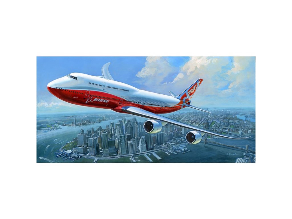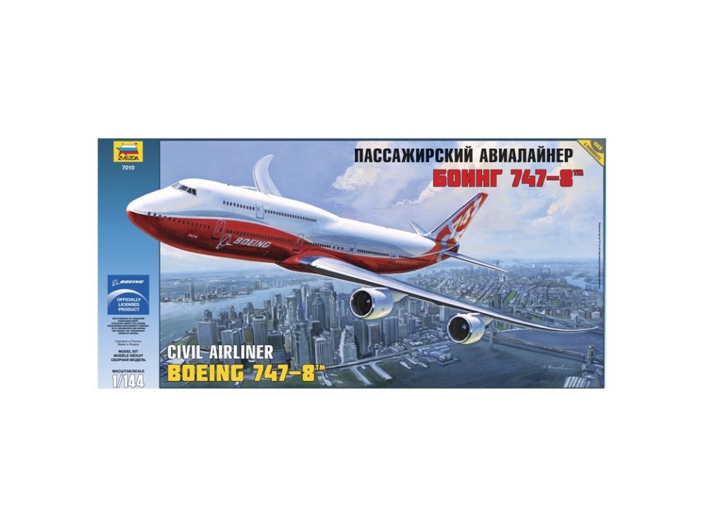Model Zvezda 7010 letadla Boeing 747-8 ke slepení. Měřítko 1:144; velikost 53 cm. Balení obsahuje 154 dílků ke slepení.