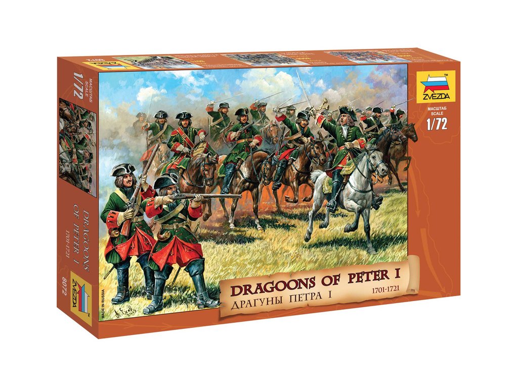 Plastikový model Zvezda 8072 - figurky dragounů Petra I. Velikého 1701/21 v měřítku 1:72. Stavebnice obsahuje 18 dílků. Ideální pro doplnění plastikových modelů či diorámat.