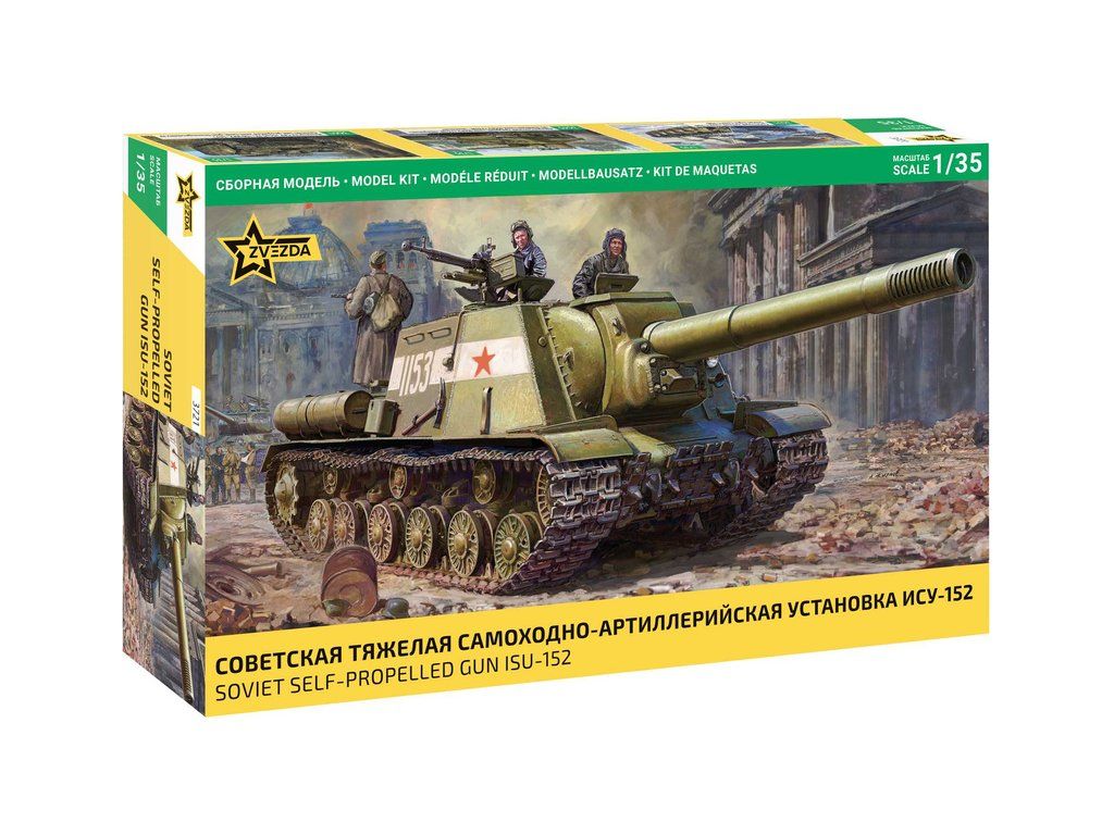 Plastikový model Zvezda 3721 - sovětský stíhač tanků ISU-152 v měřítku 1:35 ke slepení. Stavebnice obsahuje 474 dílků, délka 25,8 cm.