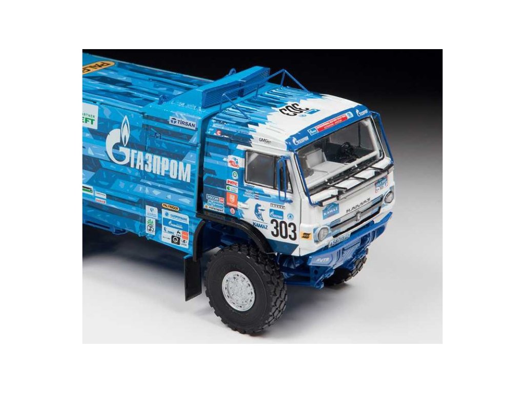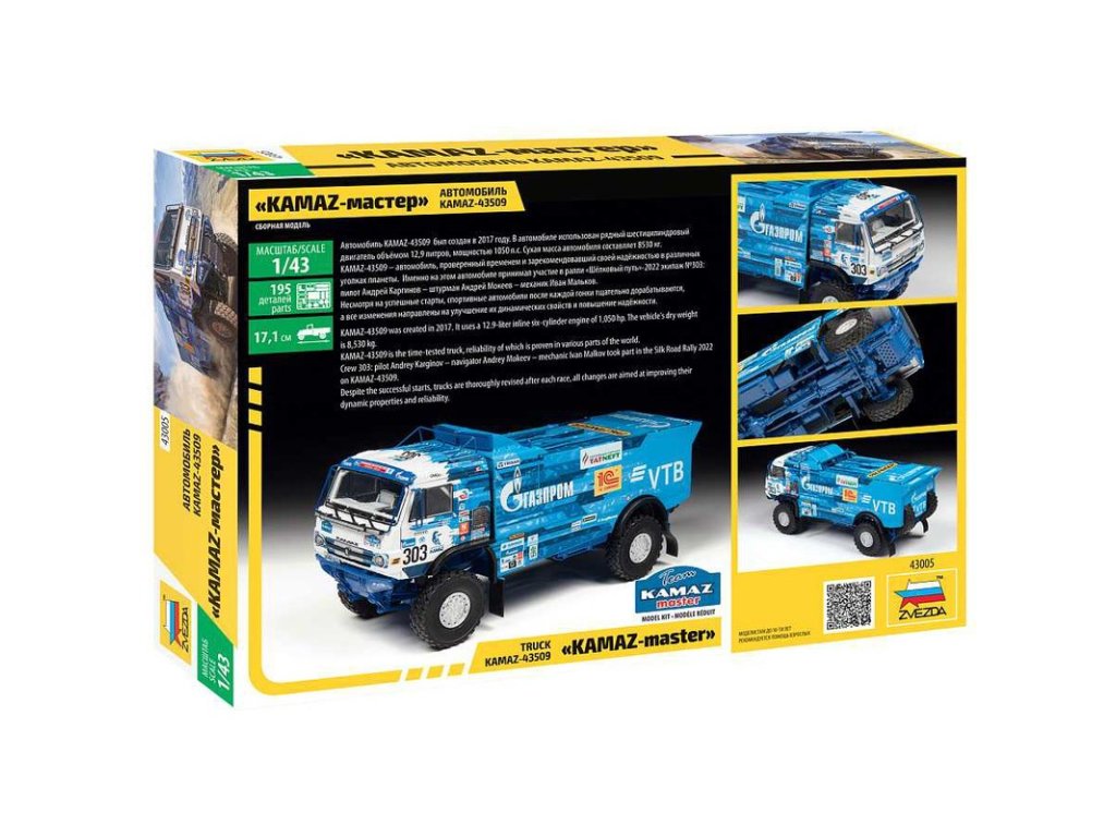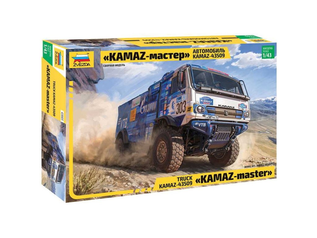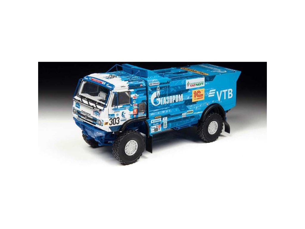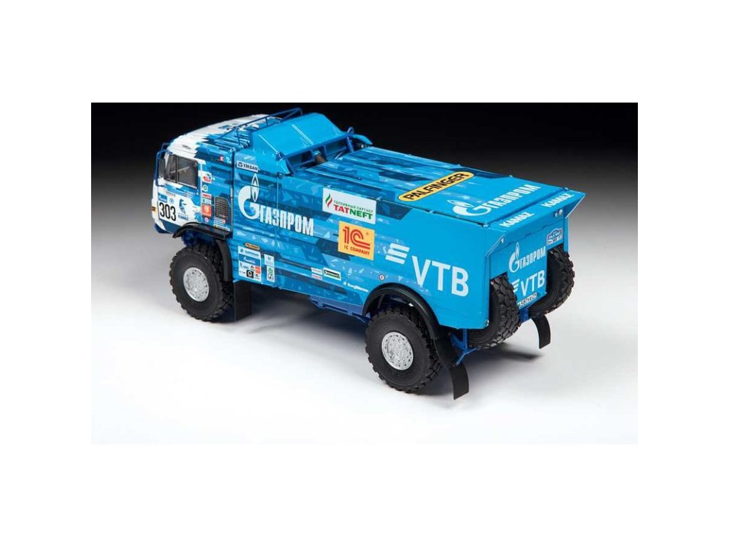 Plastikový model Zvezda 43005 - auto Kamaz Rallye truck v měřítku 1:43 ke slepení. Stavebnice obsahuje 195 dílků, délka 171 mm.