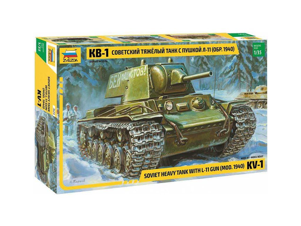 Plastikový model Zvezda 3624 - sovětský těžký tank M1940 s kanónem L-11 KV-1 v měřítku 1:35 ke slepení. Stavebnice obsahuje 243 dílků, délka 190 mm.