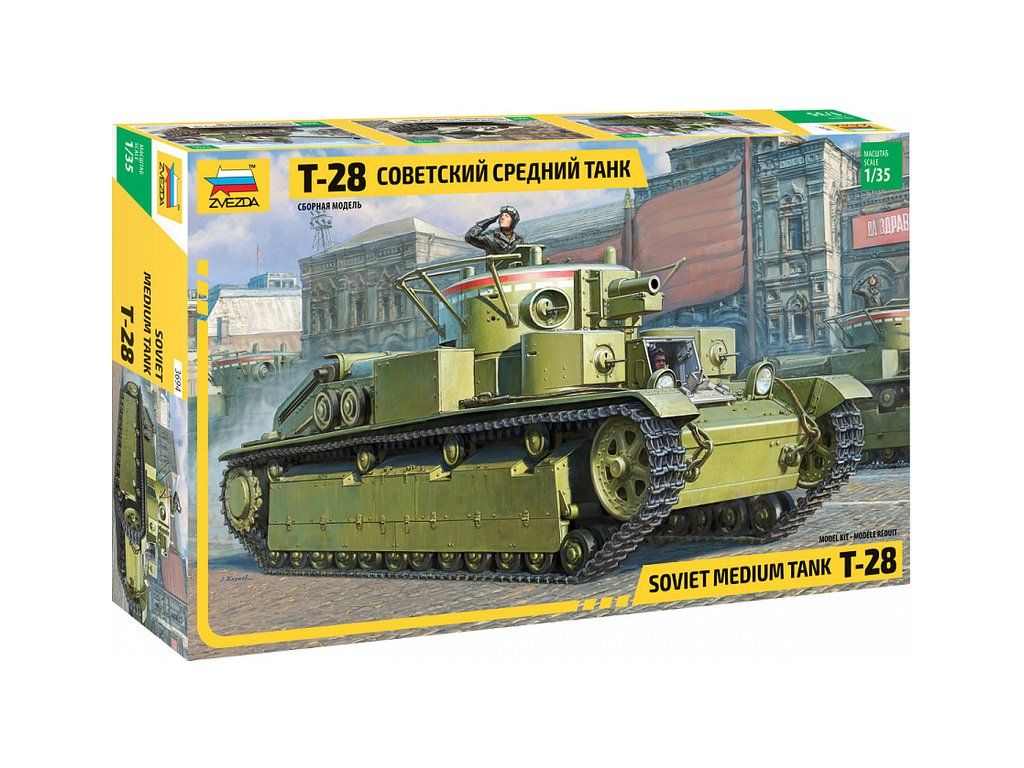 Plastikový model Zvezda 3694 - střední tank T-28 v měřítku 1:35 ke slepení. Stavebnice obsahuje 454 dílků, délka 210 mm.